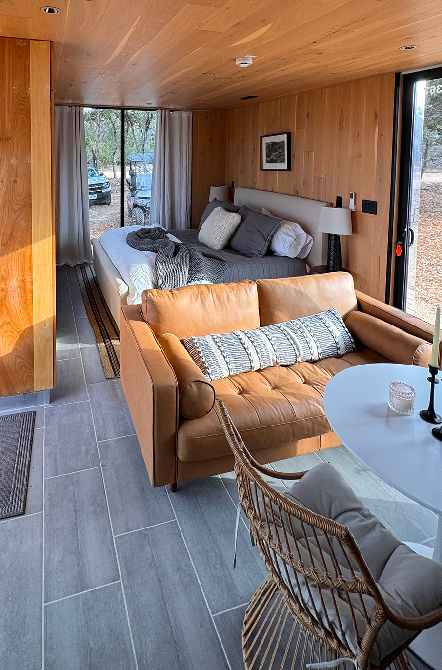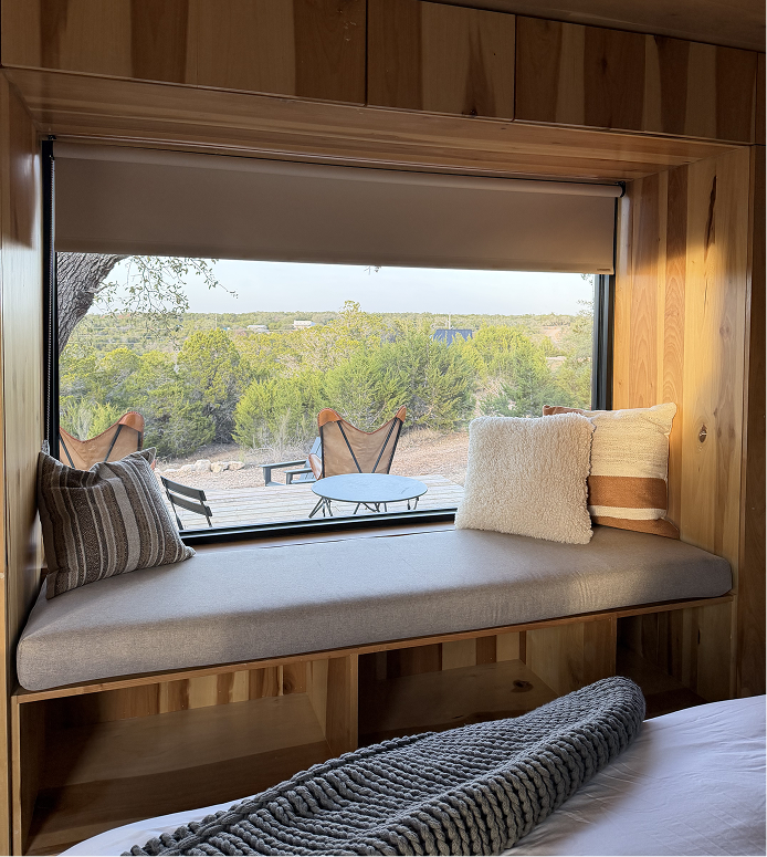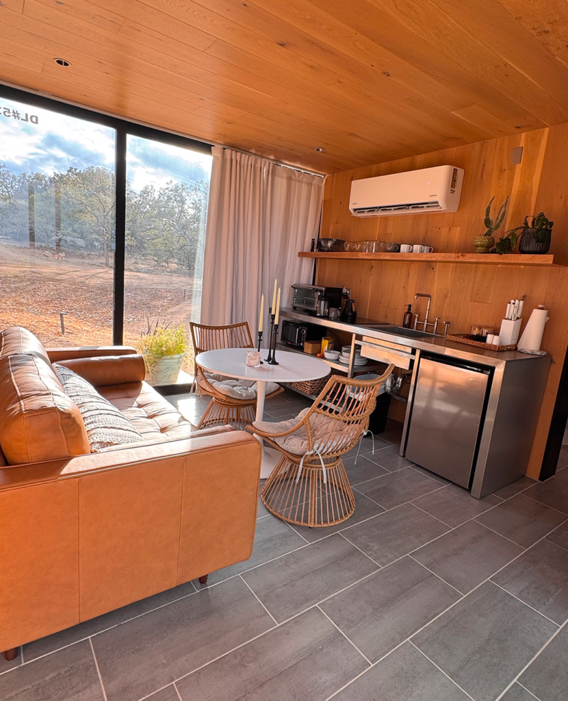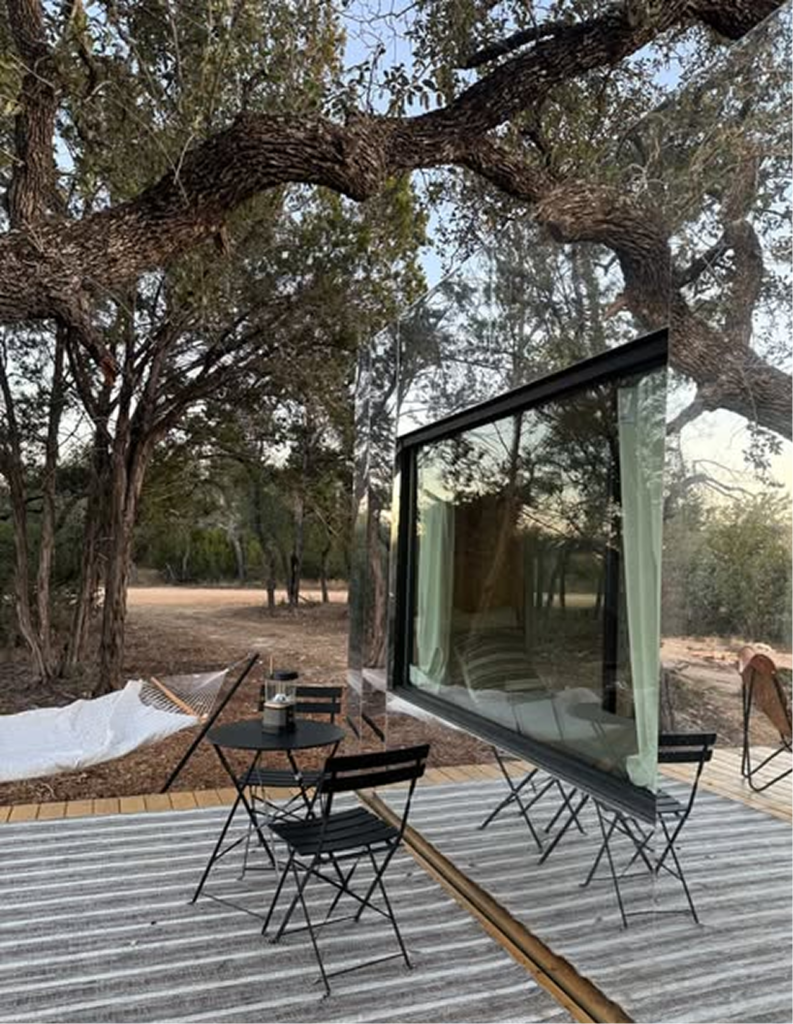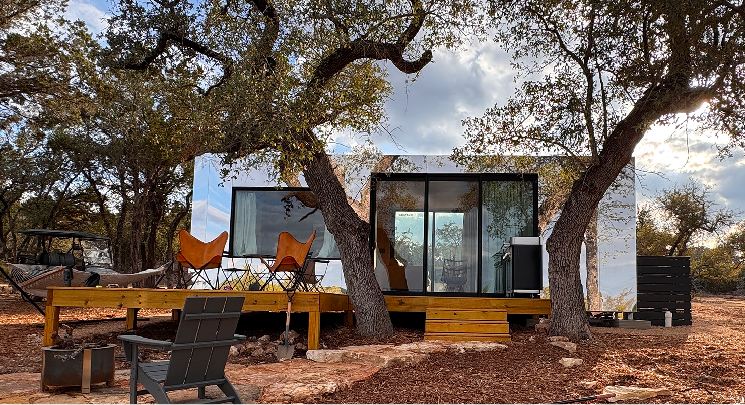 Disappear into nature inside this unique, mirror-clad king-sized suite. With a simple, rectangular design, the cabin reflects modern luxury and offers comfort to unwind while sharing a wall with the outdoors.